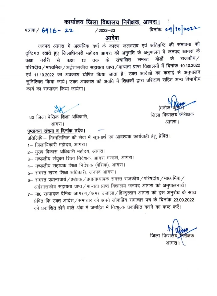 आगरा:- अत्यधिक वर्षा के कारण जनपद में दो दिन का अवकाश घोषित
