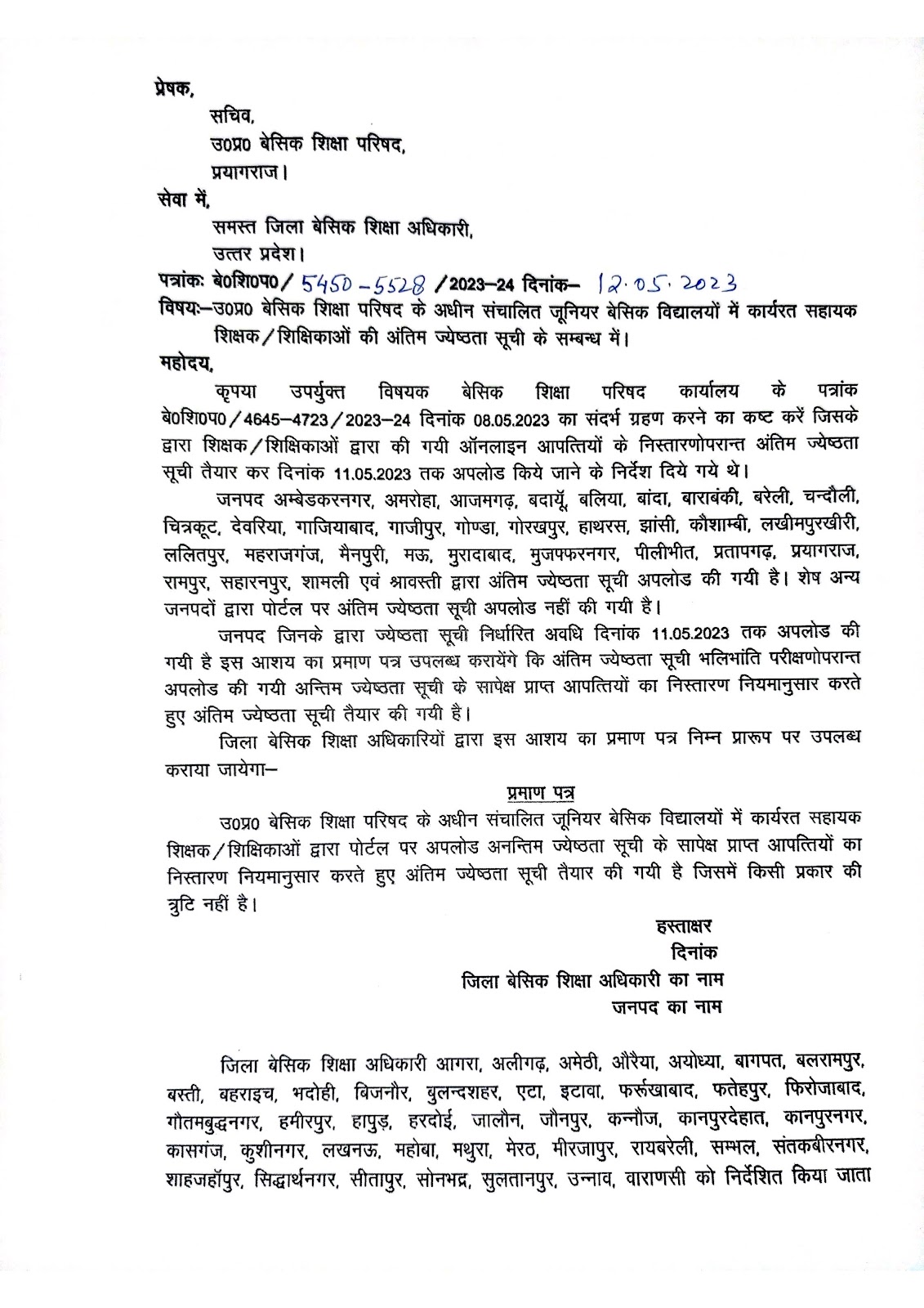 उ०प्र० बेसिक शिक्षा परिषद के अधीन संचालित जूनियर बेसिक विद्यालयों में कार्यरत सहायक शिक्षक/शिक्षिकाओं की अंतिम ज्येष्ठता सूची के संबंध में, देखें सचिव महोदय का आदेश