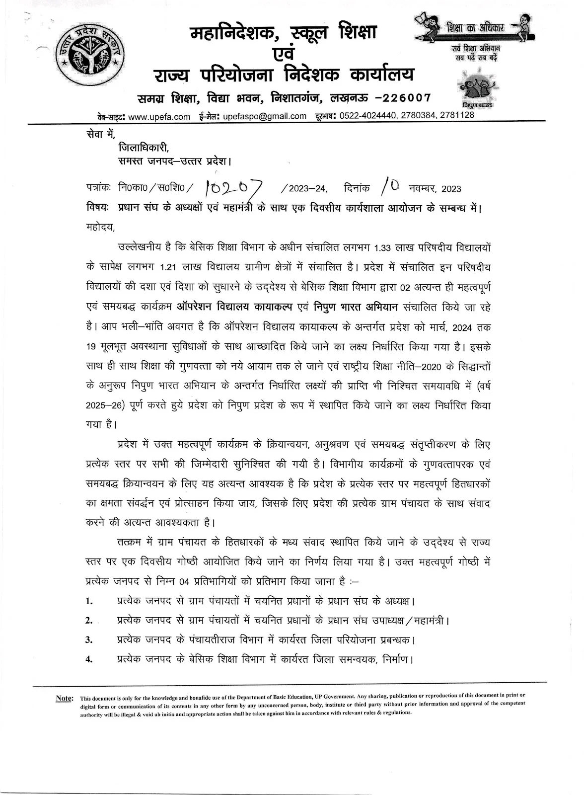प्रधान संघ के अध्यक्षों एवं महामंत्री के साथ एक दिवसीय कार्यशाला आयोजन के सम्बन्ध में