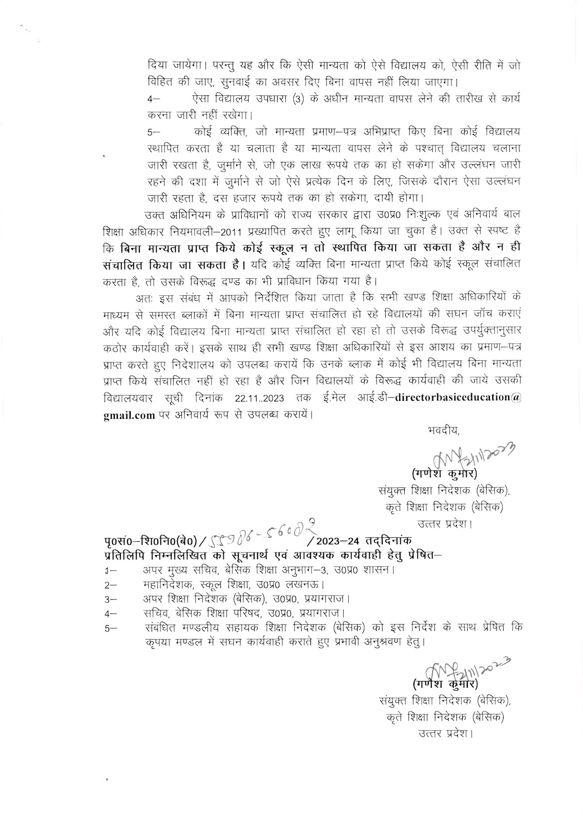 जनपद में बिना मानयता प्राप्त विद्यालयो के संचालन के विरूद्ध कार्यवाही किये जाने के संबंध में।