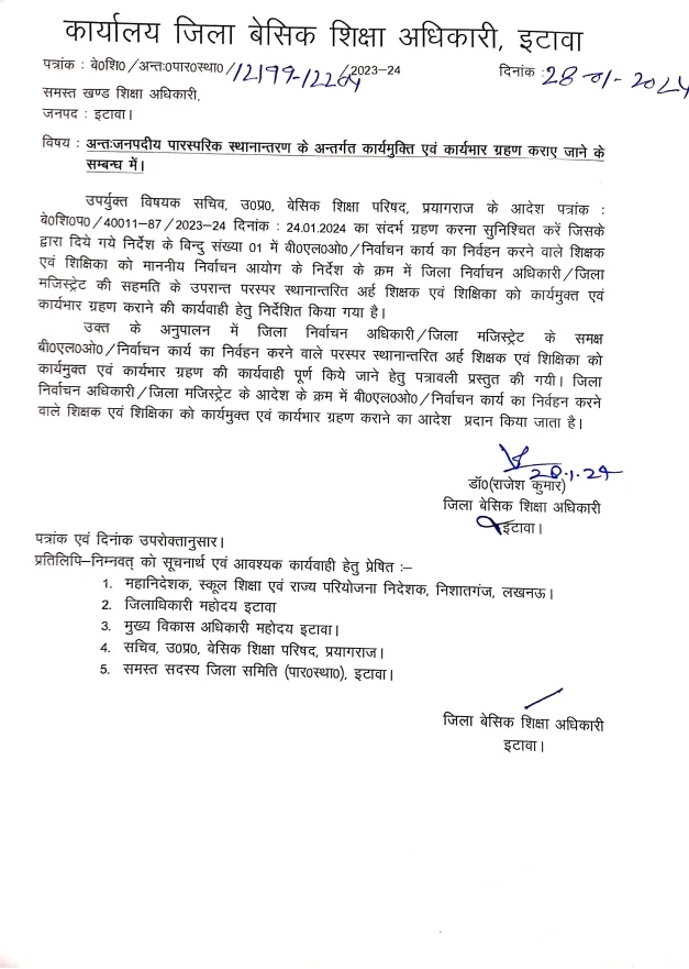 अन्तःजनपदीय पारस्परिक स्थानान्तरण के अन्तर्गत कार्यमुक्ति एवं कार्यभार ग्रहण कराए जाने के सम्बन्ध में।