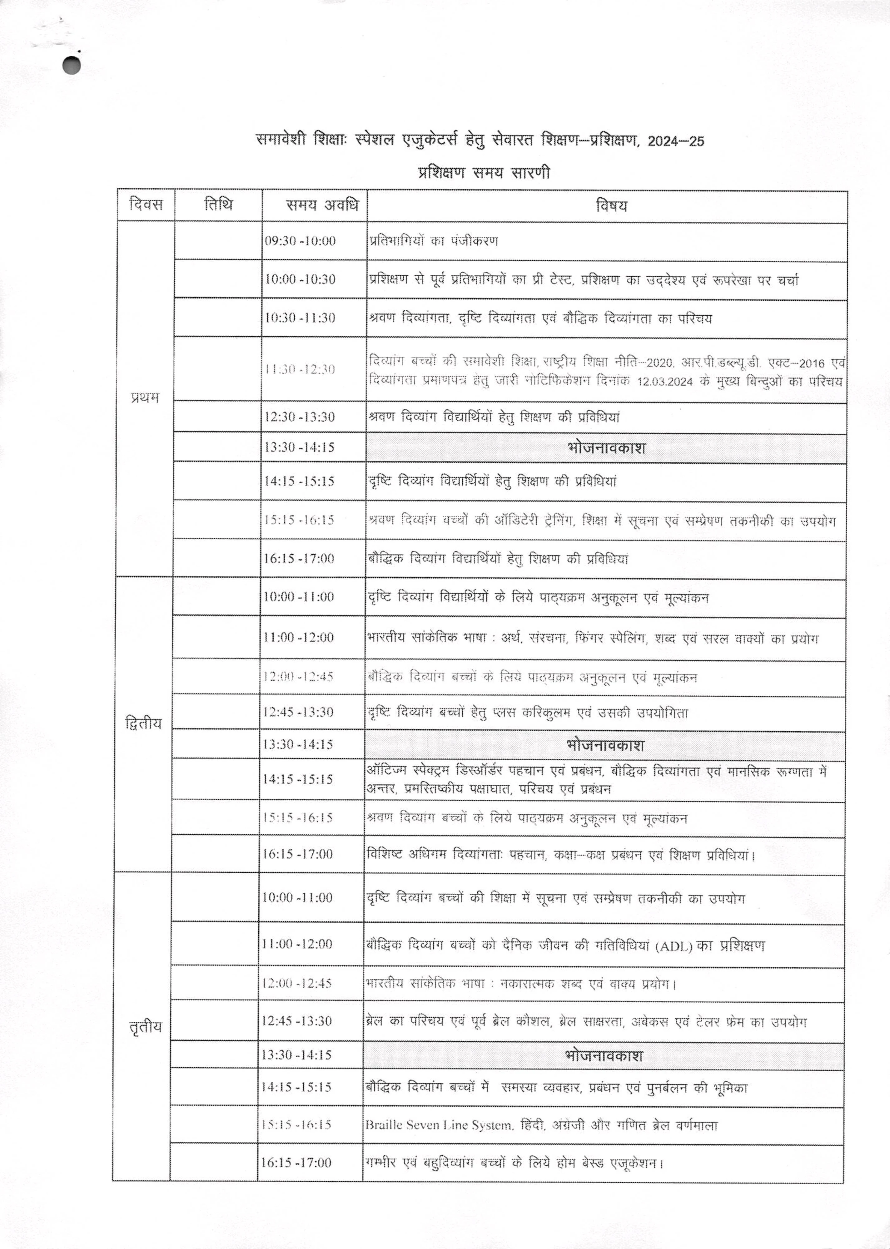 समेकित शिक्षा के अन्तर्गत स्पेशल एजुकेटर्स के चार दिवसीय सेवारत प्रशिक्षण आयोजित किये जाने के सम्बन्ध में।